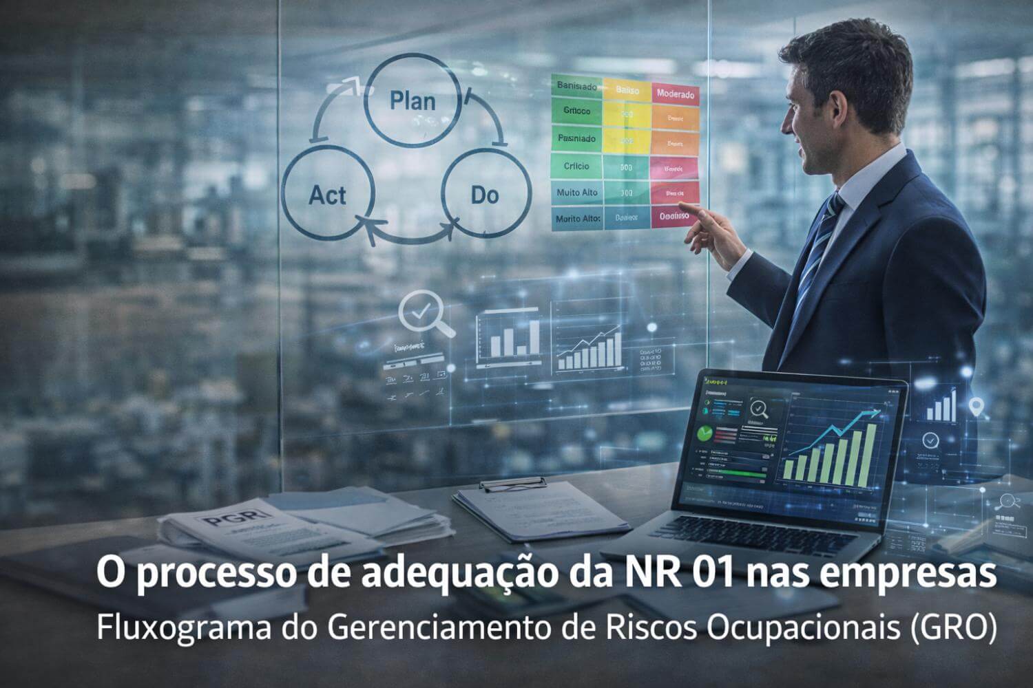 A - Agir (Melhorar) Indicadores (NR01 1. 5. 3. 4): A fase final do ciclo envolve o monitoramento contínuo e a análise de indicadores para avaliar a performance do GRO e identificar oportunidades de melhoria contínua. É representado por um gráfico de barras ascendente, simbolizando a melhoria.